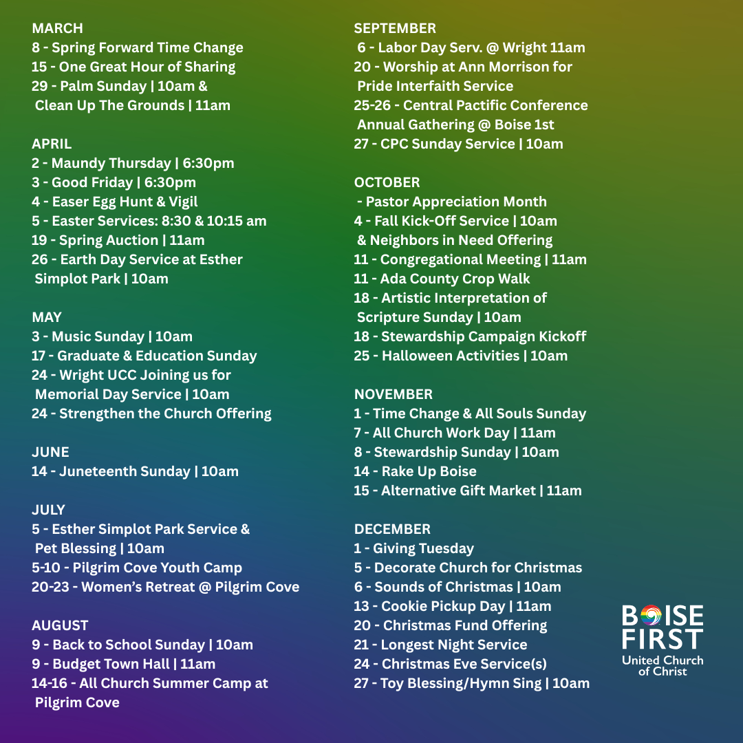 We look forward to welcoming Rev. Taylor back to Boise First UCC and hearing her powerful preaching once again. Please consider inviting friends, neighbors, or former members who may remember her ministry with gratitude.